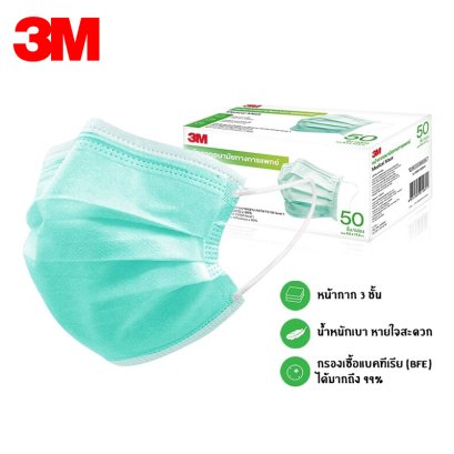 3M กล่องใหญ่ แมส หน้ากากอนามัย Face Mask Earloop ( 50ชิ้น / กล่อง ) อย่างหนา ของแท้ 100% กันฝุ่น กันเชื้อโรค กรองเชื้อแบคทีเรีย (BFE)