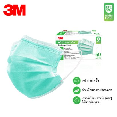 หน้ากากอนามัย 3M Face Mask Earloop 3M หน้ากากเพื่อสุขภาพ 3M พร้อมชั้นกรองพิเศษ กรองเชื้อแบคทีเรีย (BFE) ขนาดอนุภาคเฉลี่ย 3 ไมครอน