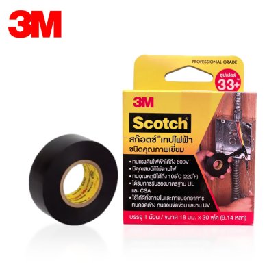 ขนาด 18 มม.x 30 ฟุต สก๊อตช์ ซุปเปอร์ 33+ Scotch Super 33+ ทนแรงดันไฟฟ้าได้ถึง 600V มีคุณสมบัติไม่ลามไฟ บรรจุ 1 ม้วน / ขนาด 18 มม.x 30 ฟุต (9.14 หลา)